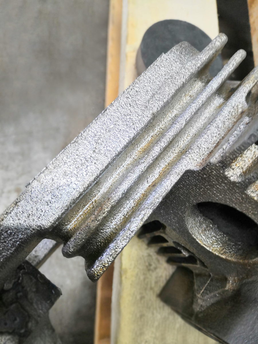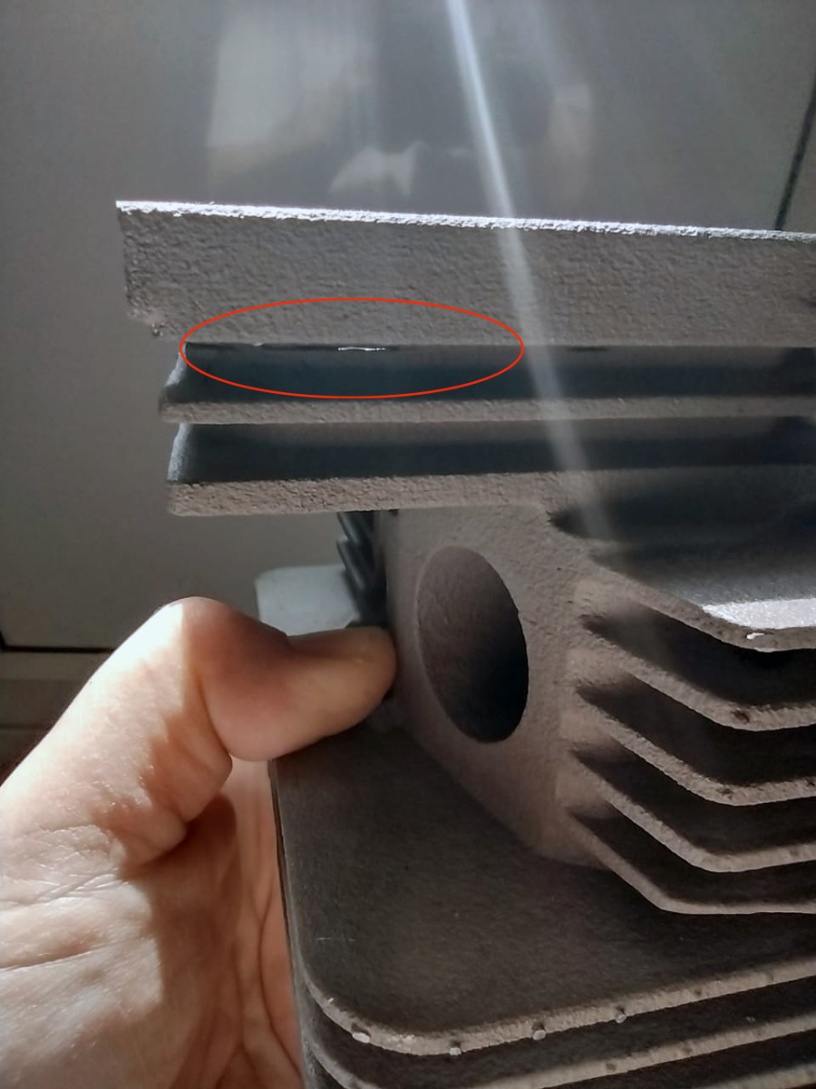 При первой пробной отливке выявились "холодные" трещины. Алюминий при остывании уменьшается в объёме примерно на 1%. При кристаллизации более массивная часть отливки «утянула» в себя металл из тонкой части, так образовалась трещина. Здесь ещё раз нам помогли новые технологии, ведь весь проект формы есть в электронном виде, и корректировка литейной технологии заняла 1 день. Мы решили проблему установкой в форму "холодильника" (металлических охлаждающих фрагментов), тем самым изменив направление кристаллизации в критичном месте. Уже на следующий день была готова доработанная форма, повторная заливка показала правильность наших расчетов.
